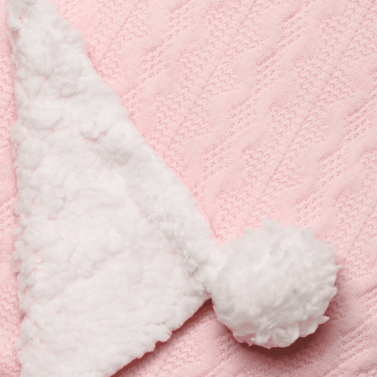 Pink Baby Knitted Wrap with Fleece Back and Fluffy Pom Poms
