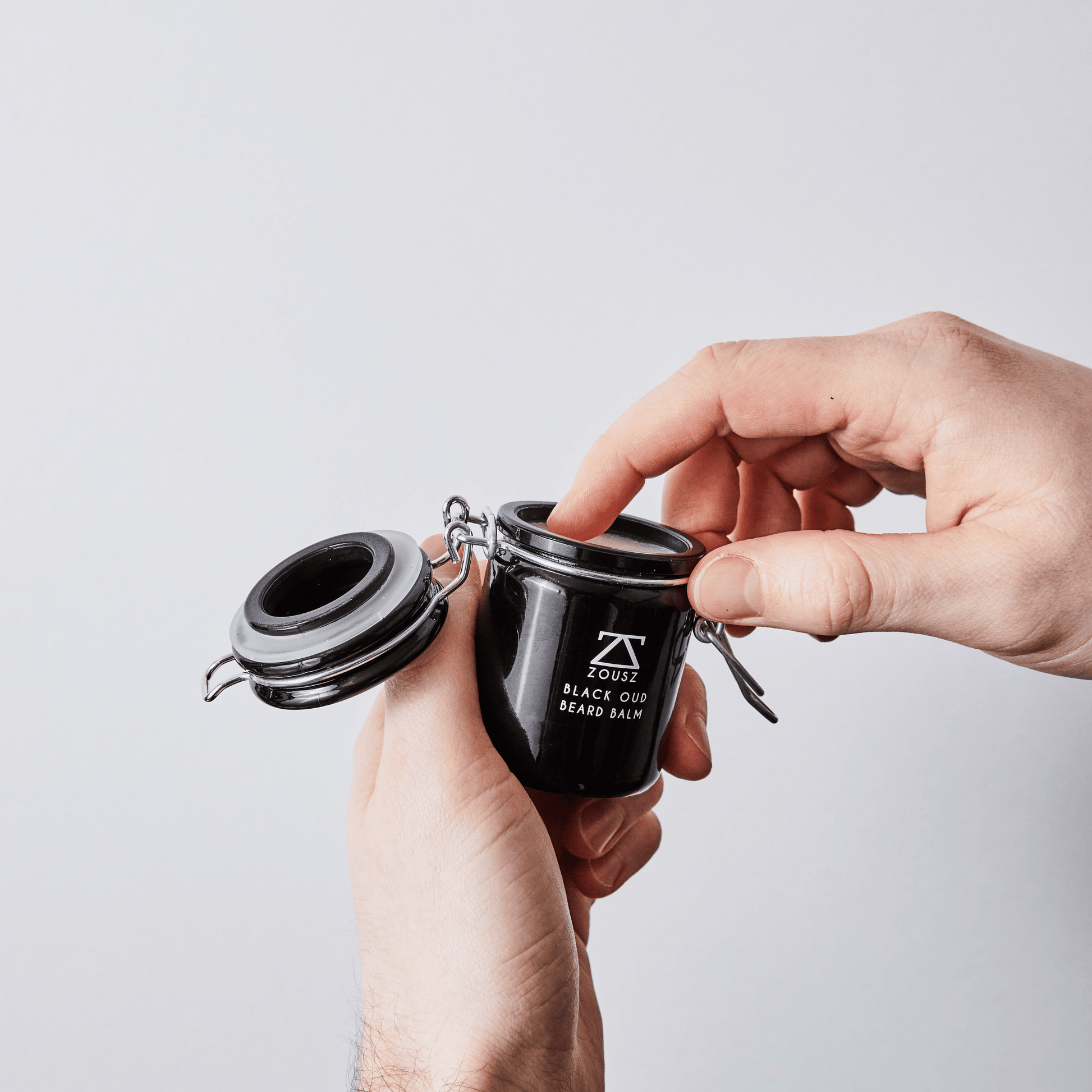 Non-greasy beard balm for conditioning, styling and protecting your beard with signature Black Oud scent
