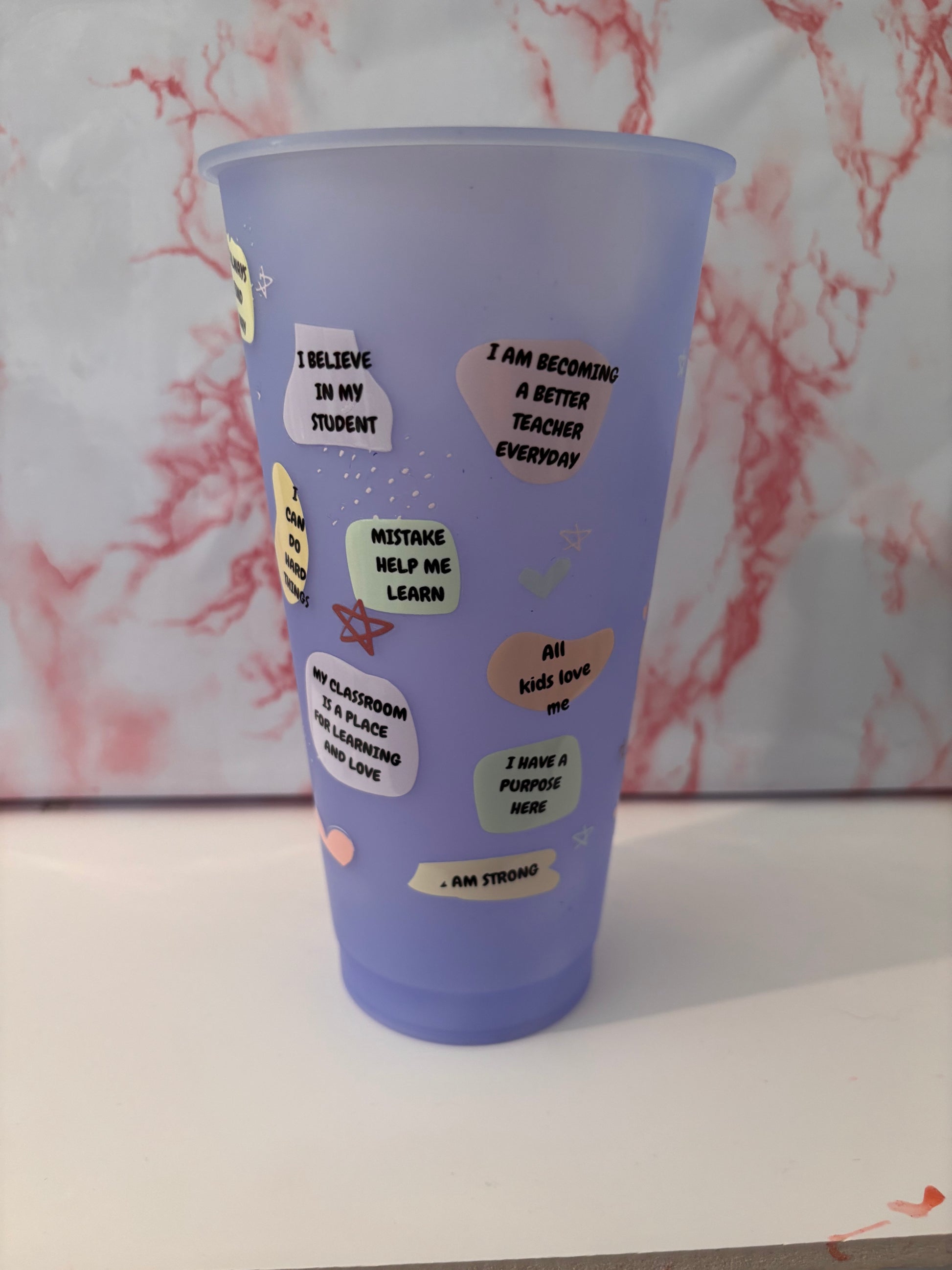 Brighten your day with every sip. Our Teacher Affirmations Cold Cup is designed to uplift and inspire, featuring positive, colourful decals like “I am an amazing teacher” and “I love what I do.”