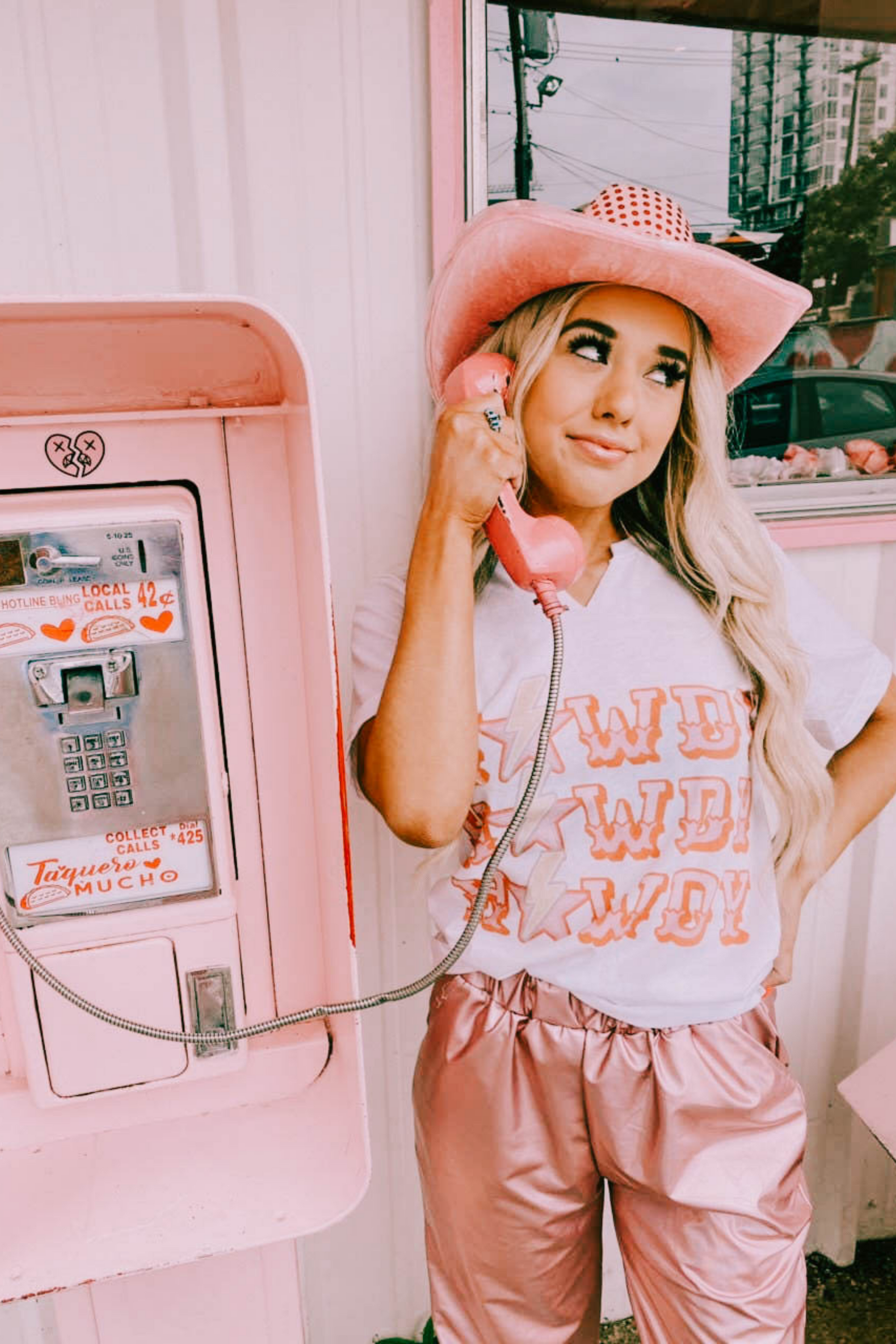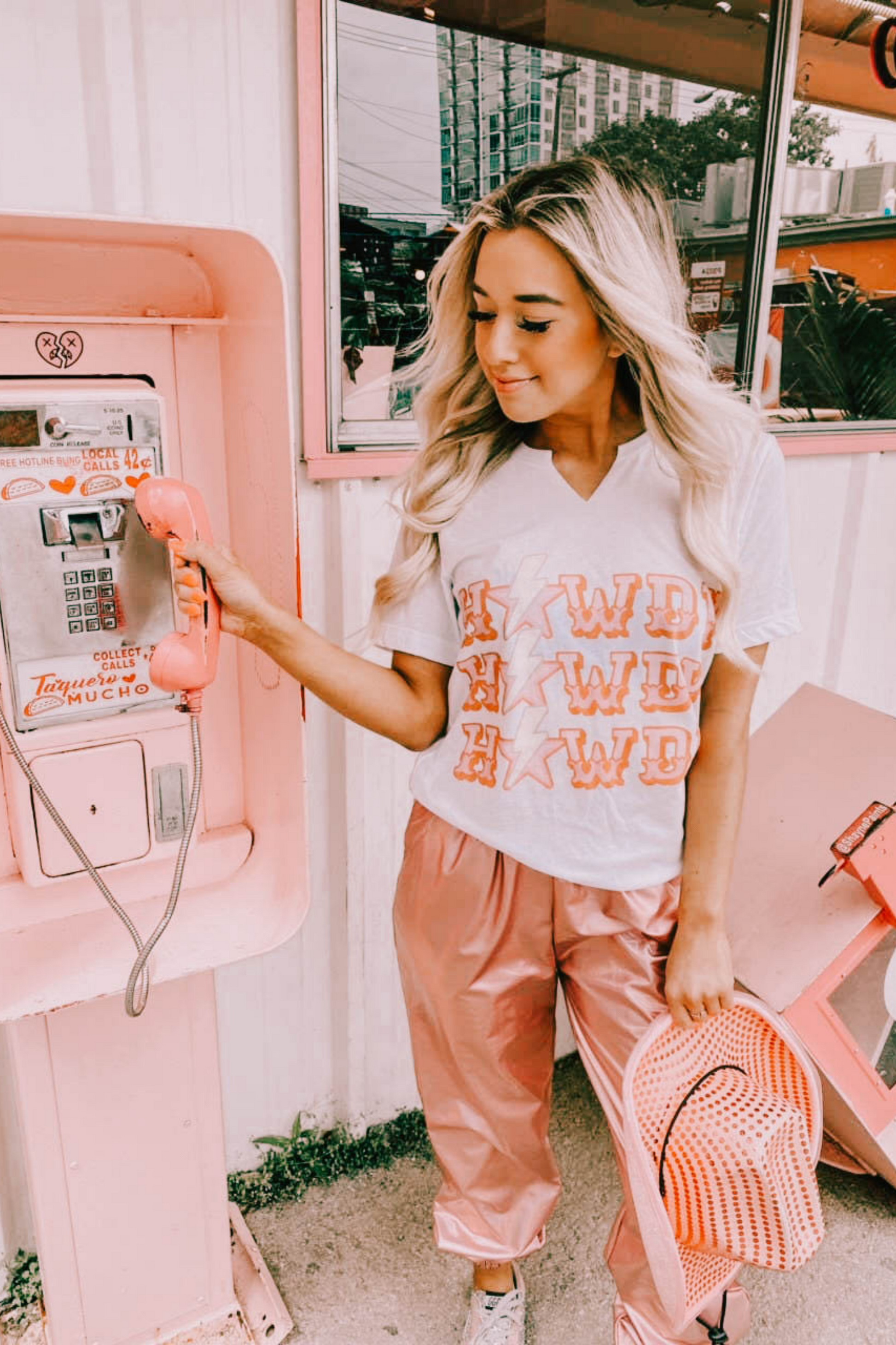 A white tee with hand cut V-neck and the cutest pink "Howdy" graphic.