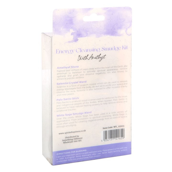 This smudge kit includes everything you need to cleanse your space of negative energies - just minus the match! Kit includes one bundle of dried white sage, a stick of palo santo, a selenite wand and an amethyst tumblestone crystal for promoting positivity and wellbeing.